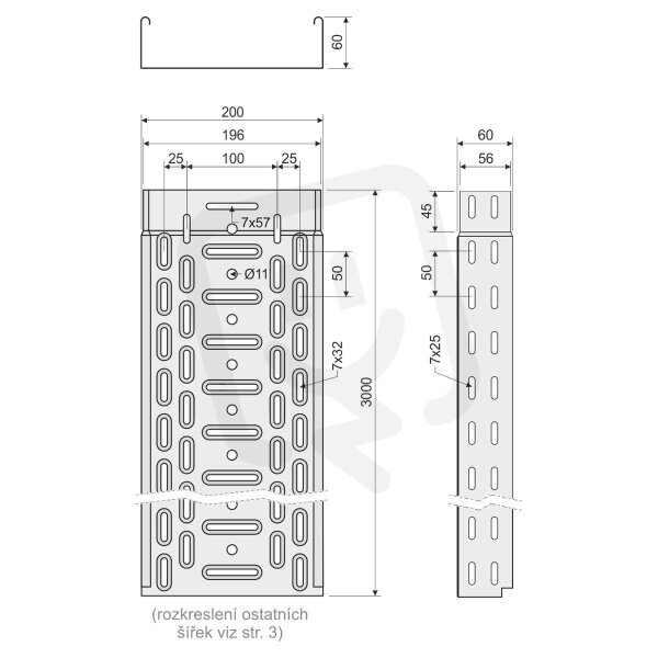 Kabelový žlab s integrovanou spojkou KZI 60x200 z plechu tloušťky 0,60 mm v povrchové úpravě sendzimir, děrovaný, opatřený embosy pro zvýšení pevnosti a tuhosti.