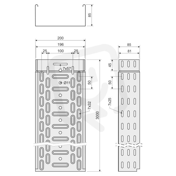 Kabelový žlab s integrovanou spojkou KZI 85x200 z plechu tloušťky 0,75 mm v povrchové úpravě sendzimir, děrovaný, opatřený embosy pro zvýšení pevnosti a tuhosti.