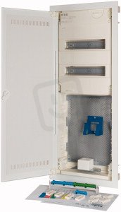 Rozvodnice KLV, hybrid, do dutých stěn, WIFI dveře s plastovou vložkou, bezšroubová svorkovnice, řad 5, modulů 28. Součást dodávky: rozvodnice, rám s přístrojovými lištami, krycí deska, N a PE svorkovnice, perforovaný montážní panel, držák přístrojů, zásuvka EURO2, integrovaná vodováha, sada upevňovacích prvků včetně prvků pro kompenzaci nerovnosti omítky, držák vodičů, sada úchytek, montážní návod. Dle normy: ČSN EN 62208, ČSN EN 60670-24