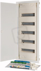 Rozvodnice KLV, pod omítku, superploché plech.dveře, bezšroubová svorkovnice, řad 5, modulů 70. Součást dodávky: rozvodnice, rám s přístrojovými lištami, krycí deska, N a PE svorkovnice, integrovaná vodováha, sada upevňovacích prvků včetně prvků pro kompenzaci nerovnosti omítky, držák vodičů, sada úchytek, montážní návod, popisovací tabulky s nálepkami. Dle normy: ČSN EN 62208, ČSN EN 60670-24, ČSN EN 61439-3
