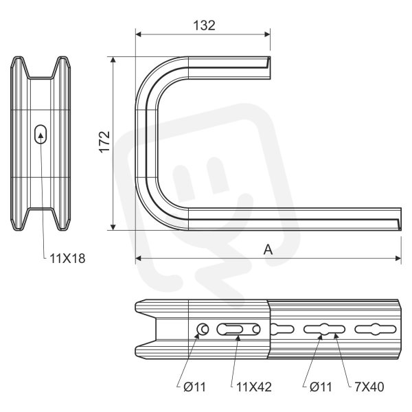 Třmen závěsný tvaru C pro montáž kabelového nosného systému na stěnu nebo strop, určen pro kabelové trasy šíře 300 mm, povrchová úprava sendzimir