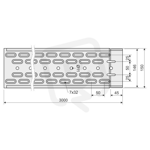 Kabelový žlab s integrovanou spojkou KZI 110x150 z plechu tloušťky 0,75 mm v povrchové úpravě žárový zinek, děrovaný, opatřený embosy pro zvýšení pevnosti a tuhosti.