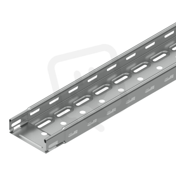 Kabelový žlab s integrovanou spojkou KZI 35x100 z plechu tloušťky 0,55 mm v povrchové úpravě sendzimir, děrovaný, opatřený embosy pro zvýšení pevnosti a tuhosti.