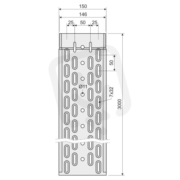 Kabelový žlab KZ 60x150 z plechu tloušťky 1,25 mm pro spojení pomocí integrované pojmy, v povrchové úpravě sendzimir, děrovaný, opatřený embosy pro zvýšení pevnosti a tuhosti, certifikovaný pro systémy se zachováním funkčnosti při požáru