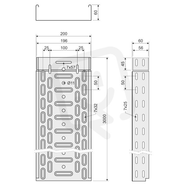 Kabelový žlab KZ 60x200 z plechu tloušťky 1,25 mm pro spojení pomocí integrované spojky, v povrchové úpravě sendzimir, děrovaný, opatřený embosy pro zvýšení pevnosti a tuhosti, certifikovaný pro systémy se zachováním funkčnosti při požáru