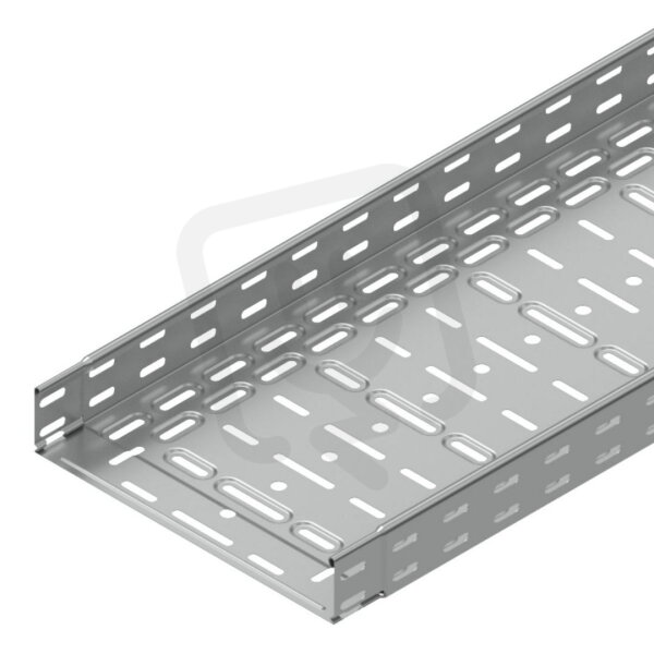 Kabelový žlab KZI 60x300 z plechu tloušťky 1,25 mm pro spojení pomocí integrované spojky, v povrchové úpravě žárový zinek, děrovaný, opatřený embosy pro zvýšení pevnosti a tuhosti, certifikovaný pro systémy se zachováním funkčnosti při požáru