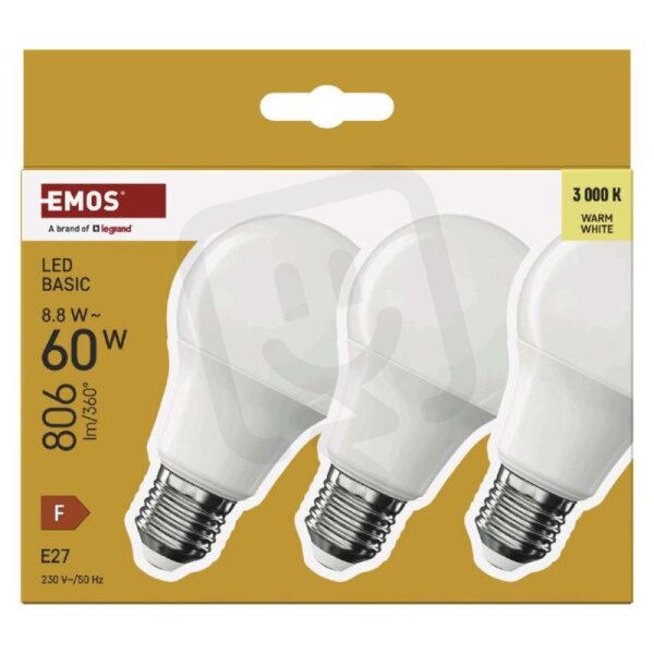 LED BASIC A60 8,8W(60W) 806lm E27 WW 3PC