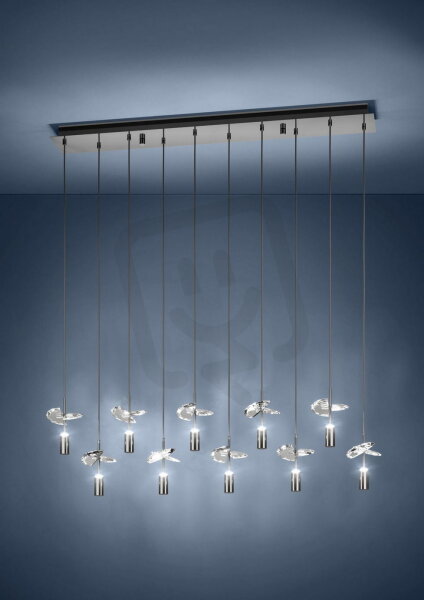 V této lineární variantě se závěsné LED svítidlo COMAREIRA ukazuje ze své moderní stránky. Na podlouhlém baldachýnu v černém chromu je rovnoměrně vedle sebe uspořádáno mnoho jemných lanových závěsů. Na spodním konci každého závěsu je jemně broušený briliantový skleněný prvek, který světlo jemně lomí a vytváří třpytivé akcenty. Horizontální uspořádání je ideální pro dlouhé jídelní stoly, pulty nebo otevřené obytné prostory. Teplota barvy světla svítidla může být pohodlně měněna pomocí vypínače ve 3 stupních. COMAREIRA v této variantě přesvědčuje svým čistým, symetrickým designem a zároveň přináší nádech luxusu do moderních interiérů.
