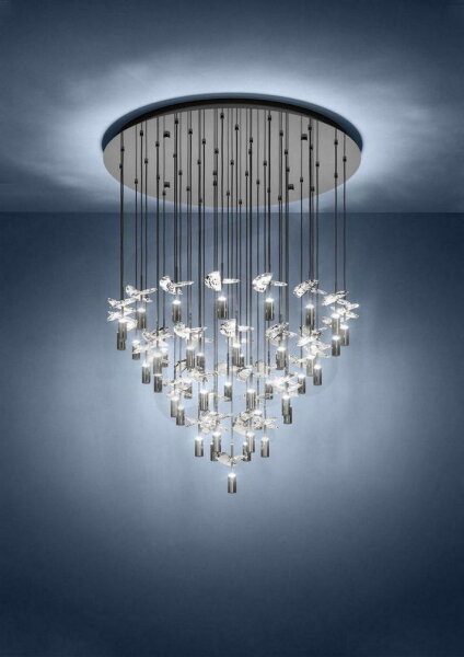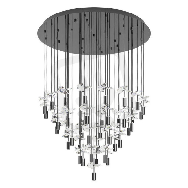 LED stropní svítidlo COMAREIRA zaujme svou luxusní atmosférou a elegantním tvarem. Mnoho závěsných prvků s průzračnými briliantovými skleněnými elementy visí z velkého baldachýnu v černém chromu a společně vytváří harmonickou, kuželovitě se zužující siluetu. Každý skleněný prvek láme světlo mnohostranným způsobem a vytváří třpytivou, atmosférickou hru světel v prostoru. Teplota barev světla se pohodlně mění pomocí vypínače ve 3 stupních. COMAREIRA je ideální pro prostorné obytné místnosti, reprezentativní haly nebo elegantní recepce a spojuje vysoce kvalitní materiály s výrazným designem.