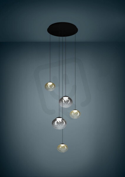LED závěsná lampa PANTOJA se stane elegantním poutačem pozornosti v moderních obytných prostorách. Pět závěsů visí v různých výškách z černého kulatého baldachýnu a nesou stylové skleněné stínidla s rýhovaným povrchem – tři v teplé jantarové barvě, dvě v ušlechtilé černo-průhledné. Tato barevná kombinace vytváří zajímavé kontrasty a atmosférickou hru světla v místnosti. Každé stínidlo z texturovaného skla jemně lomí světlo a dodává lampě noblesní vzhled. Díky integrované technologii CCT lze barevnou teplotu plynule nastavit od teplé bílé po studenou bílou. Jas je rovněž stmívatelný, ideální pro různé potřeby osvětlení – od útulného večerního světla po funkční osvětlení. Ovládání lampy je pohodlné pomocí přiloženého dálkového ovladače. Ať už v jídelně nebo v otevřeném obytném prostoru: PANTOJA stylově spojuje design, komfort a rozmanitost světla.