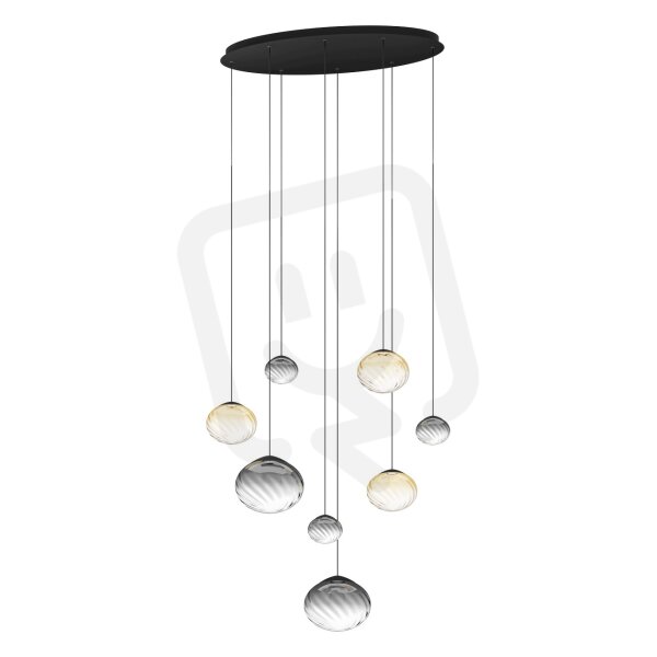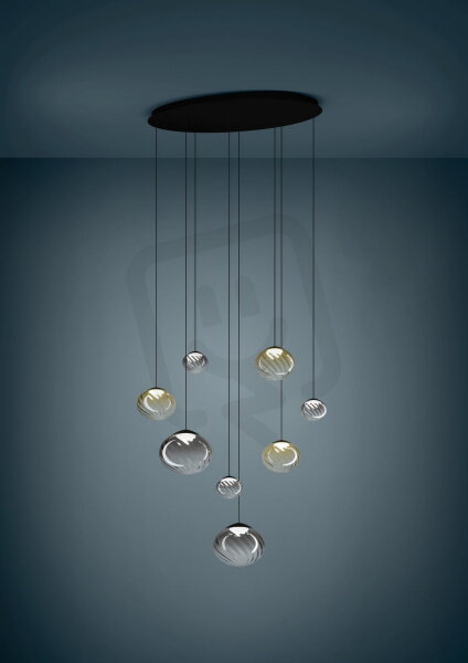 LED závěsné svítidlo PANTOJA v osmi-plamenné verzi plně rozvíjí svůj efekt jako dekorativní vrchol. Osm závěsů visí v různých výškách z velkého oválného baldachýnu v černé barvě a nesou rýhované skleněné stínidla ve dvou odstínech – teplý jantar a chladná černá transparentní. Tato barevná kombinace vytváří zajímavé kontrasty a atmosférickou hru světel, která se obzvláště uplatní v otevřených obytných prostorách, galeriích nebo schodištích. Strukturované skleněné povrchy zajišťují měkké světelné odlesky a ušlechtilý vzhled. Integrovaná funkce CCT umožňuje plynulé nastavení barevné teploty od teplé bílé po studenou bílou, zatímco stmívací funkce poskytuje maximální flexibilitu. Ovládání světla je pohodlné pomocí přiloženého dálkového ovladače. PANTOJA spojuje dekorativní estetiku s komfortní funkcí na nejvyšší úrovni.