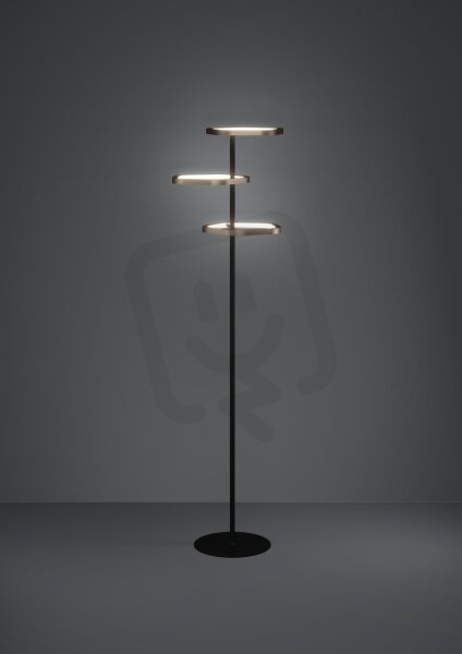LED stojací lampa ESTRELLA kombinuje funkční osvětlení s sochařským tvarem. Tři kruhové světelné prvky v elegantním bronzovém provedení jsou posunuty na štíhlém černém ocelovém rámu – jejich uspořádání připomíná zářící nebeská tělesa. Každý ze světelných kruhů je individuálně otočný, takže lze světlo cíleně nasměrovat v prostoru – ideální pro zónové osvětlení, akcentaci nebo difuzní základní osvětlení