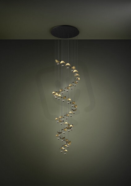 Tento moderní lustr není jen zdrojem světla, ale skutečným uměleckým dílem. S impozantní výškou přes 3 metry přitahuje všechny pohledy a stává se ústředním prvkem každé místnosti. Jedinečné vlnité prvky lustru jsou osvětleny zespodu malými světelnými zdroji, díky čemuž zlatá spodní strana září vznešeným leskem. Perfektní pro vysoké stropy a prostorné místnosti, které vyžadují zvláštní akcent.