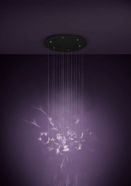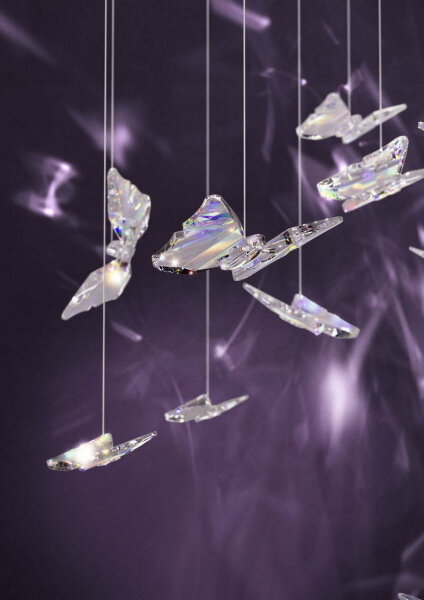 Vdechněte svému prostoru dotek magie s tímto ohromujícím lustrem. Svítidlo je tvořeno četnými malými motýly vyrobenými z vysoce kvalitního briliantového skla. Povrch motýlů je irizující, takže světlo odrážejí v ohromující paletě barev. Světlo je umístěno v stropní rozetě a osvětluje motýly shora, aby zazářily. Jakmile světlo dopadne na motýly, vzniká fascinující efekt „wow“, který vaše stěny zalije pestrými barvami a vytvoří jedinečnou atmosféru. Perfektní pro moderní obytné prostory, které potřebují zvláštní akcent.