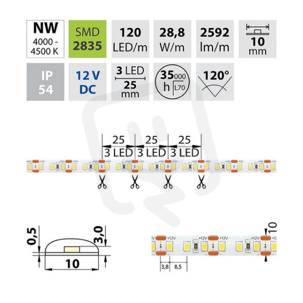LED pásek SMD2835, neutrálně bílá (4200K), 28,8W, 120LED, 2592lm/m, segment 25mm, 3LED/segment, IP54, DC 12V, životnost 54000h, šíře 10mm, bílý PCB pásek, max. délka pásku při jednostranném zapojení: 5m, opatřen samolepící páskou 3M, UV stabilní.