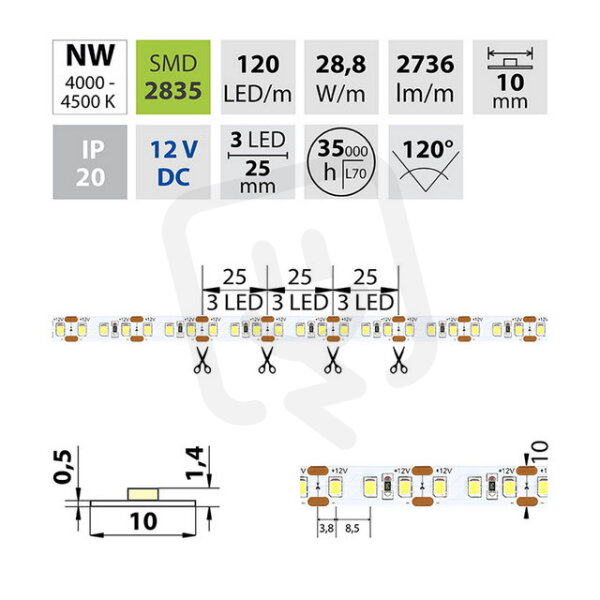 LED pásek SMD2835, neutrálně bílá (4200K), 28,8W, 120LED, 2736lm/m, CRI>90, segment 25mm, 3LED/segment, IP20, DC 12V, životnost 54000h, šíře 10mm, bílý PCB pásek, max. délka pásku při jednostranném zapojení: 5m, opatřen samolepící páskou 3M, UV stabilní.