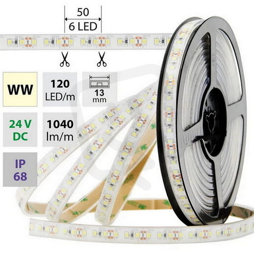 LED pásek SMD2835, 2800-3100K (teple bílý WW), 14W, 120LED, 1040lm/m, segment 100mm, 6LED/segment, IP68, DC 24V, životnost 54000h, šíře 13mm, bílý PCB pásek, max. délka pásku při jednostranném zapojení: 5m, opatřen samolepící páskou 3M, UV stabilní. Balení 5m.