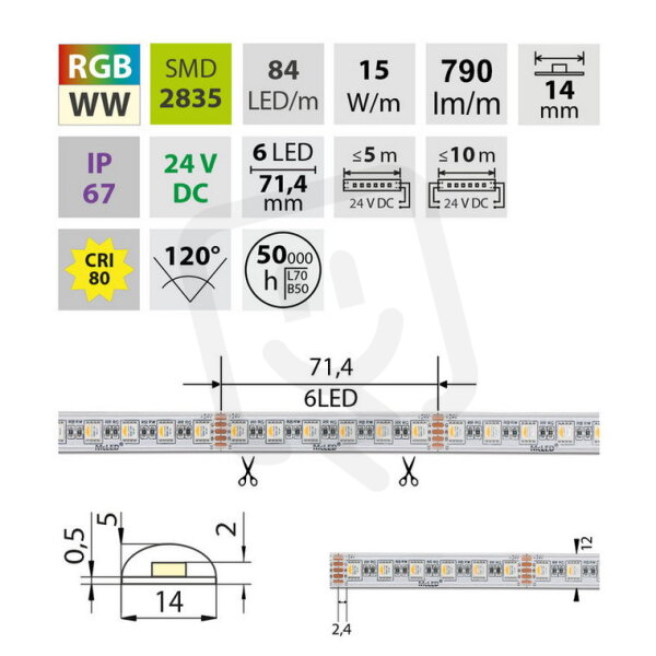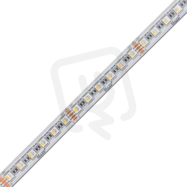 LED pásek SMD5050, RGB + teplá bílá (3000K), 15W, 84LED, 790lm/m, CRI>80, segment 71,43mm, 6LED/segment, IP67, DC 24V, životnost 50000h, šíře 14mm, bílý PCB pásek, max. délka pásku při jednostranném zapojení: 5m, opatřen samolepící páskou 3M.