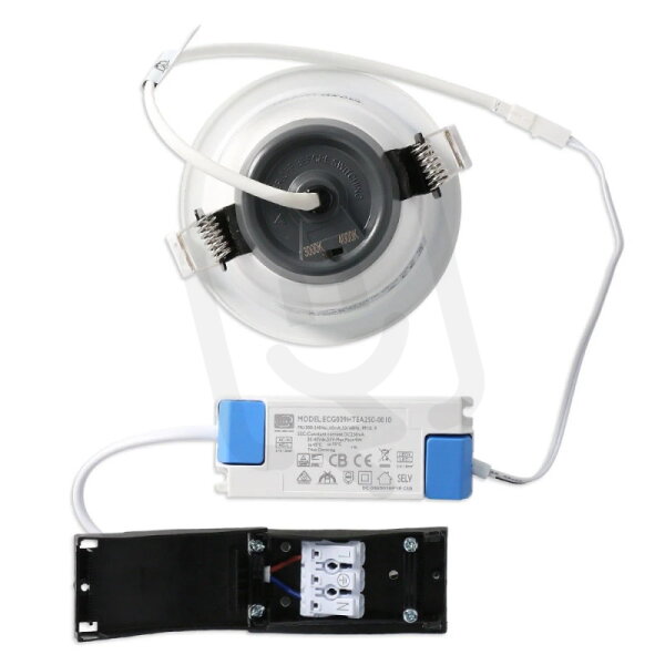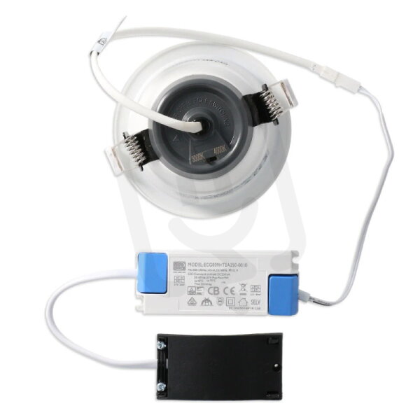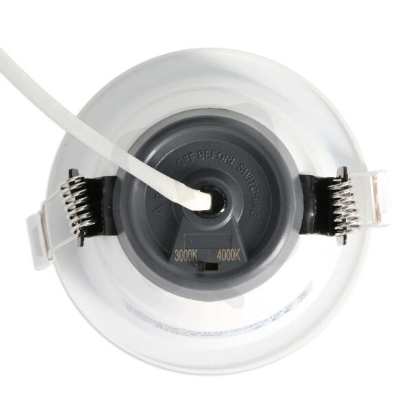 LED podhledové svítidlo 10W, 230V, IP64/IP20, 2CCT - teplá nebo neutrální bílá, světelný tok 830lm/3000K, 900lm/4000K, vyzařovací úhel 90°, CRI 90, životnost 100.000h, rozměry ∅ 108x71mm, montážní otvor ∅ 92-98mm, materiál hliník/plast, stmívatelné triak, PF>0,9, s přepínačem teploty chromatičnosti 3000/4000K
