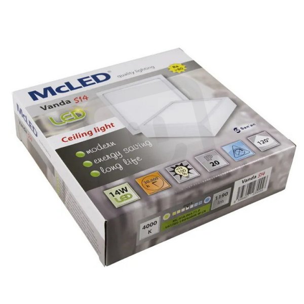 LED přisazené svítidlo Vanda S14, 14W (ekvivalent 100W), 230V, IP20, 4000K - neutrální bílá, světelný tok 1190lm, vyzařovací úhel 120°, Ra>80, životnost až 30.000h, rozměry 172x172x42mm, materiál hliník/plast, nestmívatelné, PF>0,9