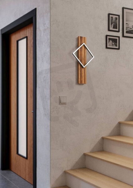 Nástěnné LED svítidlo BOYAL kombinuje přirozené kouzlo s grafickým designem. Vertikální nosná deska s rustikálním dýhovým povrchem z pravého dřeva tvoří základ tohoto svítidla a dodává mu teplý, domácký vzhled. V kontrastu k tomu stojí černý, čtvercový světelný těleso z kovu, které je šikmo namontováno a dodává designu moderní, dynamický nádech. Integrované LED diody poskytují příjemné, teplé bílé světlo, které je vyzařováno nepřímo podél rámu. BOYAL je ideální pro chodby, obytné prostory nebo jako dekorativní světelný objekt v ložnicích. Díky svému zvláštnímu tvaru působí svítidlo stylově jak samostatně, tak v kombinaci s dalšími svítidly ze série.