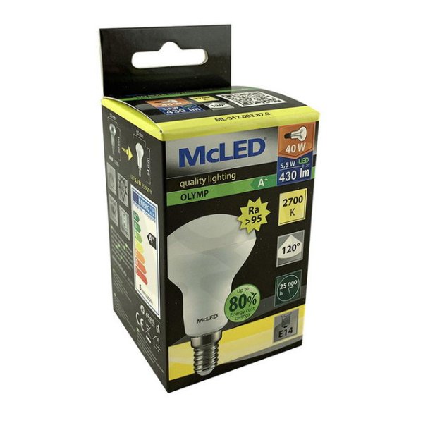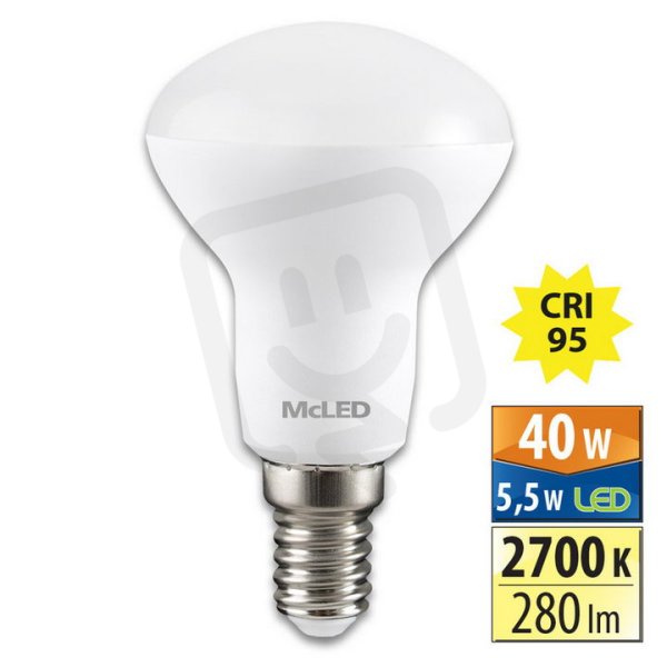 LED žár. R50 5,5W, 2700K, E14, CRI 95, v najdete v kategoriích Světelné zdroje, Světelné zdroje LED, LED světelný zdroj, Svítidla, světelné zdroje a LED osvětlení, výrobce McLED, EAN 8595607236799, kód dodavatele ML-317.003.87.0. LED žárovka R50 5,5W, 2700K, E14, CRI 95, 120°, 360° 280lm, PF 0,5, 42mA nabízíme od 1 ks. Kód EMAS LED žár. R50 5,5W, 2700K, E14, CRI 95, v je ELOSOS0892571.