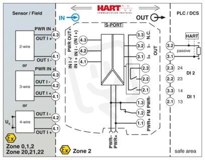 Ex i-Napájecí a vstupní oddělovací zesilovač se 2 limitními relé, napájí 2-, 3- nebo 4vodičový měřicí převodník a přenáší 1:1 pasivní nebo aktivní vstupní signály 0 mA / 4 mA ... 20 mA a disponuje 2 konfigurovatelnými limitními výstupy. počet kanálů: 1, Standardní konfigurace, 4cestné oddělení, Safety Integrity Level (SIL, IEC 61508): 2, Šroubové připojení
