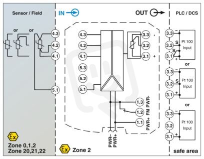 Ex i-Odporový oddělovací transformátor pro jiskrově bezpečný provoz odporových teploměrů Pt 100 ve 2-, 3- nebo 4vodičové technice a snímačích odporu. Hodnoty měřené u jiskrově bezpečného vstupu se 1:1 přenáší na jiskrově nezabezpečený výstup. počet kanálů: 1, Standardní konfigurace, 3cestné oddělení, Svorky Push-in