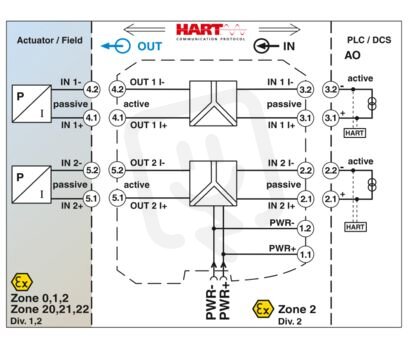 Jiskrově bezpečný 2kanálový výstupní oddělovací zesilovač, transparentní pro HART. Odděluje a přenáší signály 0/4–20 mA jiskrově bezpečným způsobem k zátěži v oblasti s nebezpečím výbuchu. Galvanické 4cestné oddělení, detekce chyb ve vedení, SIL 2 (SC3) podle normy IEC 61508, přípojka push-in.