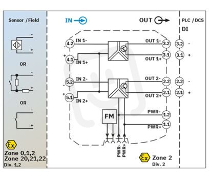 Ex i-Oddělovací spínací zesilovač NAMUR pro provoz bezdotykových iniciátorů přiblížení a spínačů v prostředí s nebezpečím výbuchu. Signály jsou přenášeny na každý kanál přes 1 tranzistorový výstup (pasivní) do bezpečné oblasti. počet kanálů: 2, Standardní konfigurace, 3cestné oddělení, Detekce chyb ve vedení, Safety Integrity Level (SIL, IEC 61508): 2, Systematic Capability: 3, Šroubové připojení