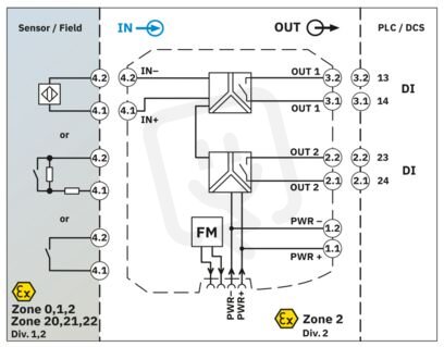 Oddělovací zesilovač NAMUR v provedení Ex i. K provozu bezdotykových iniciátorů přiblížení a spínačů v oblasti s nebezpečím výbuchu. Signály jsou 2 reléovými výstupy (spínač) přenášeny do bezpečné oblasti. Detekce chyb ve vedení (LFD), třícestné oddělení, SIL 2.