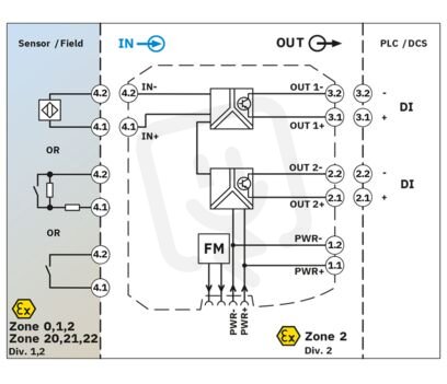 Ex i-Oddělovací zesilovač NAMUR pro provoz bezdotykových iniciátorů přiblížení a přepínačů v oblastech s nebezpečím výbuchu. Signály jsou přenášeny pasivně přes 2 tranzistorové výstupy do bezpečné oblasti. počet kanálů: 1, Standardní konfigurace, 3cestné oddělení, Detekce chyb ve vedení, Safety Integrity Level (SIL, IEC 61508): 2, Systematic Capability: 3, Svorky Push-in