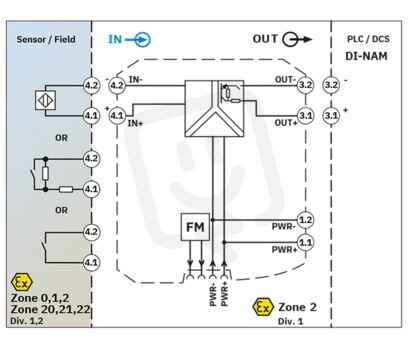 Ex i-Oddělovací spínací zesilovač NAMUR pro provoz jiskrově bezpečných bezdotykových iniciátorů přiblížení a spínačů v prostředí s nebezpečím výbuchu. Pasivní tranzistorový výstup (odporový podle EN 60947-5-6). počet kanálů: 1, Standardní konfigurace, 3cestné oddělení, Transparentnost chyby vedení, Safety Integrity Level (SIL, IEC 61508): 2, Systematic Capability: 3, Šroubové připojení