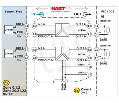 Oddělovací zesilovač napájení měřicího převodníku Ex i, 2kanálový, transparentní pro HART. Zajišťuje napájení 2vodičových měřicích převodníků Ex i a přenáší signál 4 ... 20 mA z oblasti s nebezpečím výbuchu do bezpečné oblasti. Galvanické 5cestné oddělení; přípojka Push-in, do SIL 3, PL.