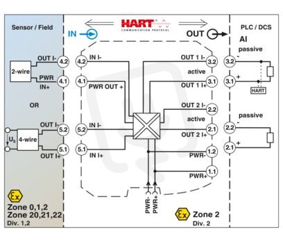 Ex i-Oddělovací zesilovač napájení měřicího transformátoru a vstupní oddělovací zesilovač, pouze výstup 1 je transparentní pro HART. Přenáší napájené nebo aktivní signály z prostředí s nebezpečím výbuchu galvanicky oddělené na dvě zátěže.. počet kanálů: 1, Transparentnost pro HART, Standardní konfigurace, Safety Integrity Level (SIL, IEC 61508): 2, Performance Level (ISO 13849): d / KAT 2, Systematic Capability: 3, Šroubové připojení