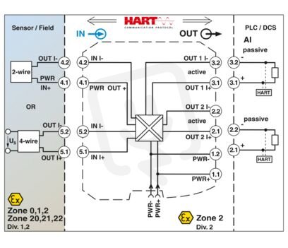 Ex i-Oddělovací zesilovač napájení měřicího transformátoru a vstupní oddělovací zesilovač přenáší napájené nebo aktivní signály 0 mA / 4 mA ... 20 mA z prostředí s nebezpečím výbuchu galvanicky oddělené na dvě zátěže v bezpečném prostředí.. počet kanálů: 1, Transparentnost pro HART, Standardní konfigurace, 3cestné oddělení, Safety Integrity Level (SIL, IEC 61508): 2, Performance Level (ISO 13849): d / KAT 2, Systematic Capability: 3, Svorky Push-in