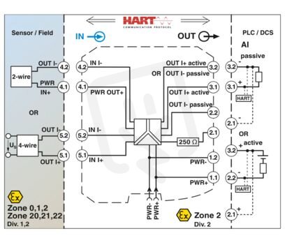 Jiskrově bezpečný napájecí a vstupní oddělovací zesilovač, transparentní pro HART. Přenáší napájecí nebo aktivní 0/4–20mA signály z oblasti s nebezpečím výbuchu k zátěži (aktivně nebo pasivně) do bezpečné oblasti. Galvanické 3cestné oddělení, SIL 2 podle IEC 61508, se šroubovým připojením