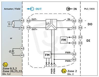 Modul řízení ventilu v provedení Ex i pro řízení magnetických ventilů v provedení Ex i v oblasti s nebezpečím výbuchu, logický vstup, napětí při běhu naprázdno, 22,6 V, omezení proudu při 48 mA, transparentnost při chybě ve vedení, výstup chybového hlášení do SIL 3 podle normy IEC 61508; technika šroubového připojení