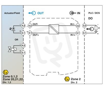 Modul řízení ventilu Ex i. Pro jiskrově bezpečné ovládání magnetických ventilů Ex-i instalovaných v oblasti s nebezpečím výbuchu, modulů alarmu nebo diod LED. Omezení proudu při 48 mA. Pro plyny do skupiny IIC, napájení ze smyčky, galvanické oddělení, SIL 3. Šroubový uzávěr.