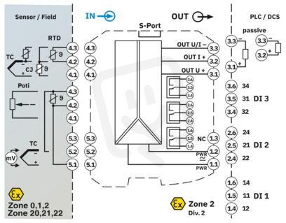 Volně programovatelný teplotní převodník Ex i s analogovým výstupem a 3 limitními relé, jiskrově bezpečné signální vstupy, odporový teploměr s 2-, 3- nebo 4vodičovou technikou, termoelektrické články, napájení s širokým rozsahem. Standardní konfigurace, 4cestné oddělení, Safety Integrity Level (SIL, IEC 61508): 2, Performance Level (ISO 13849): d, Systematic Capability: 2, Šroubové připojení