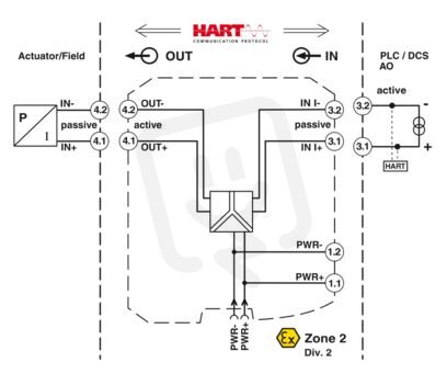 Výstupní oddělovací zesilovač, transparentní pro HART. Odděluje a přenáší signály 0/4–20 mA k zátěži v bezpečné oblasti. Galvanické 3cestné oddělení, detekce chyb ve vedení (odpojitelné pomocí DIP přepínače), SIL 2 (SC3), podle normy IEC 61508, šroubové připojení.