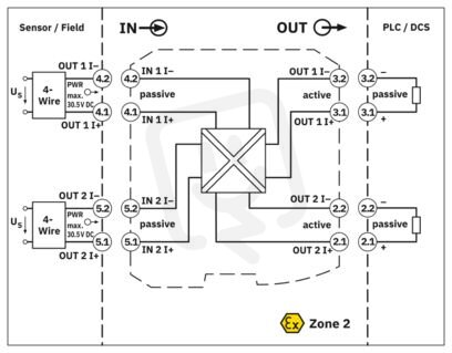 Pasivní oddělovač napájený ze vstupní smyčky, se zvýšeným oddělovacím napětím pro galvanické oddělení signálů 0 mA/4 mA ... 20 mA. Vstupní signál = výstupní signál. počet kanálů: 2, Standardní konfigurace, napájení ze smyčky, 2cestné oddělení, Safety Integrity Level (SIL, IEC 61508): 3, Svorky Push-in