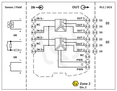 Oddělovací spínací zesilovač NAMUR s širokorozsahovým napájecím zdrojem pro bezdotykové iniciátory přiblížení a spínače. Jako signální výstup je u každého kanálu k dispozici 1 relé s přepínacím kontaktem.. počet kanálů: 2, Standardní konfigurace, 3cestné oddělení, Safety Integrity Level (SIL, IEC 61508): 2, Systematic Capability: 3, Šroubové připojení