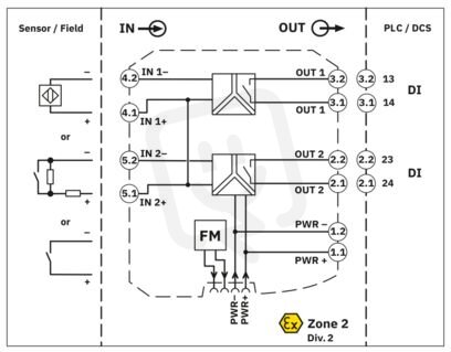 Oddělovací zesilovač NAMUR, 2kanálový pro provoz přibližovacích iniciátorů a přepínačů. Signály jsou k úrovni řízení přenášeny reléovými výstupy (spínač). Detekce chyb ve vedení, galvanické 3cestné oddělení, SIL 2, přípojka Push-in.