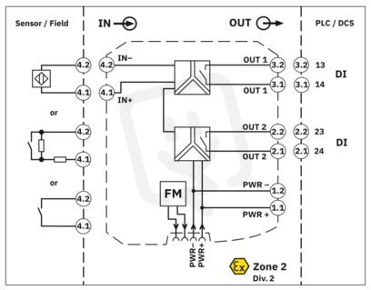 Oddělovací zesilovač NAMUR, pro provoz bezdotykových iniciátorů přiblížení a přepínačů. Signály jsou k úrovni řízení přenášeny 2 oddělenými reléovými výstupy (spínač). Detekce chyb ve vedení (LFD), galvanické 3cestné oddělení, SIL 2, přípojka Push-in.