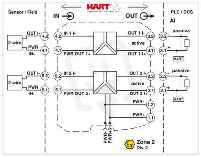 2kanálový oddělovací zesilovač napájení pro provoz 2vodičových měřicích převodníků, vstup: 4–20 mA (napájecí), výstup: 4–20 mA (aktivní), obousměrný přenos digitálních komunikačních signálů HART, s přípojkou push-in, SIL, PL.