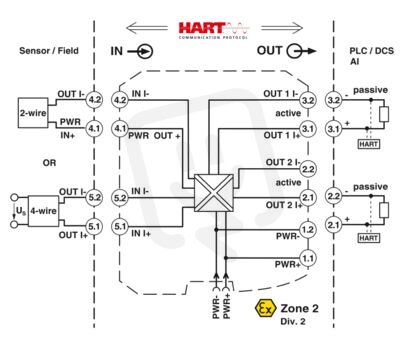 Oddělovací zesilovač napájení měřicího transformátoru a vstupní oddělovací zesilovač přenáší napájené nebo aktivní signály 0 mA / 4 mA ... 20 mA z pole galvanicky oddělené na dvě zátěže. počet kanálů: 1, Transparentnost pro HART, Standardní konfigurace, 3cestné oddělení, Safety Integrity Level (SIL, IEC 61508): 2, Performance Level (ISO 13849): d / KAT 2, Systematic Capability: 3, Šroubové připojení
