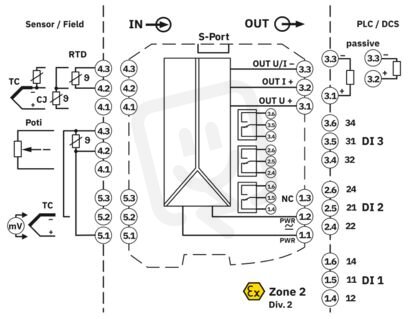 Volně programovatelný teplotní převodník s analogovým výstupem a 3 limitními relé, odporový teploměr s 2-, 3- nebo 4vodičovou technikou, termoelektrické články, napájení s širokým rozsahem. Standardní konfigurace, 4cestné oddělení, Safety Integrity Level (SIL, IEC 61508): 2, Performance Level (ISO 13849): d, Systematic Capability: 2, Šroubové připojení