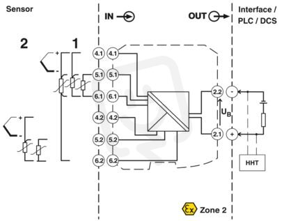 Teplotní převodník napájený z výstupní smyčky k přenosu až 2 signálů snímačů odporového teploměru a TC a snímačů odporu a napětí prostřednictvím 4 mA ... 20 mA. HART, Oddělovací zesilovače s funkční bezpečností SIL, Standardní konfigurace, Safety Integrity Level (SIL, IEC 61508): 2, Systematic Capability: 3, Svorky Push-in