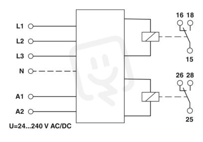 3fázové napěťové kontrolní relé, s kontrolou přepětí, podpětí a napěťového okna a také funkcemi pro kontrolu sledu fází, chyby ztráty fáze, asymetrie (nastavitelná asymetrie) a nulového vodiče. Širokorozsahový napájecí zdroj s 24 V AC/DC … 240 V AC/DC, s nastavitelnými prahovými hodnotami, zpožděním odezvy a podporou paměti chyb a NFC komunikace. Test skutečné efektivní hodnoty